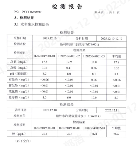 1、废水:废水排放口设于公司院外西北侧,2014年经过规范化改造,设有在线监测仪、标识牌、电子显示屏、电子监控、等设施。目前公司废水产生量约200m3/h,经公司污水处理场处理后部分回用,剩余污水排入市政管网。2025年各运行生产装置稳定运转,环保设施及其他配套设施均运行正常。公司手工监测的外排废水各项指标情况见下表:
