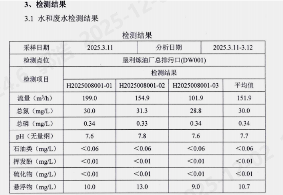 1、废水:废水排放口设于公司院外西北侧,2014年经过规范化改造,设有在线监测仪、标识牌、电子显示屏、电子监控、等设施。目前公司废水产生量约200m3/h,经公司污水处理场处理后部分回用,剩余污水排入市政管网。2025年各运行生产装置稳定运转,环保设施及其他配套设施均运行正常。公司手工监测的外排废水各项指标情况见下表: